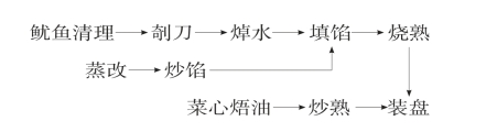 (1)鱿鱼处理:①将鱿鱼择洗干净,在背部剞十字花纹焯水,待用。②五花肉切成鸡冠片焯水待用。