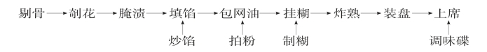 (1)剔骨腌渍:从鱼的背部剖开,剔去龙骨、肋骨,两面剞花刀,用姜、葱汁、绍酒10克、酱油15克、盐、花椒粉、白胡椒匀擦鱼身,腌渍10分钟。