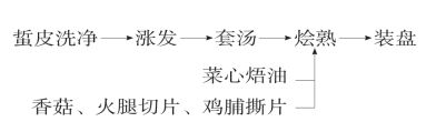 (2)组配:将火腿切成8厘米×2.5厘米大片;鸡脯肉撕成鹅毛大片;香菇批成大片;菜心剖开,焐油成熟待用。将上述原料与海蜇皮组合成鸡火蜇皮生坯。