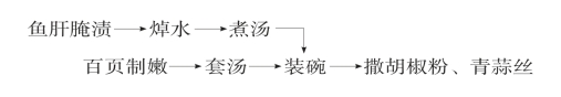(2)鱼肝焯水:①将鱼肝洗净切成4厘米长段,放入碗中加50克绍酒浸渍。②清水在锅中加热烧沸,放姜块、精盐10克与醋,下鱼肝入锅烧沸3分钟捞出漂洗。