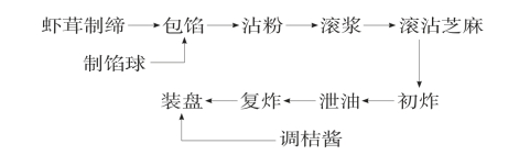 原料:净虾茸250克,油炸杏仁20只,干淀粉30克,熟冻猪油150克,葱末25克,火腿茸10克,鸡蛋2只取黄,花椒粉5克,金橘饼末5克,精盐3克,白芝麻100克,鲜橘150克,白糖10克,果醋5克,姜葱汁5克,植物油1000克(耗50克)。
