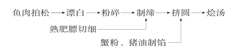 (1)制缔:将鱼肉刮茸或拍松在清水中漂白,粉碎成茸状,将猪肥膘剁极细,与鱼茸、鸡汤300克和匀,分两次加盐5克搅拌起黏,加葱姜汁、鸡蛋清继续搅拌上劲,再下50克猪油和匀即成鱼圆缔。
