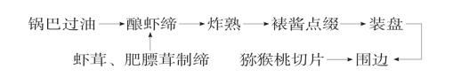 (2)炸熟成菜:①将锅巴虾投入180℃油中炸至金黄捞出。②将沙律酱装入裱花筒里,在每片锅巴虾上裱出花纹饰,撒火腿与芹菜末点缀后装盘。③将猕猴桃切片围边,点缀上樱桃番茄即成。