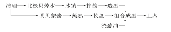 (3)制熟造型:①用果汁辣沙司混合酱与北极贝拌匀,在西瓜莲托里摆成花样造型,装在大盘中。②将日月贝入沸水笼蒸6分钟取出围在瓜托一周,同时用清油45克烧热冲入葱末成葱油,分别淋在日月贝上即成。