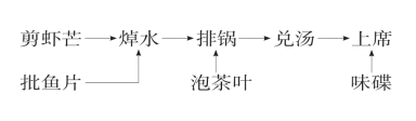 (1)排锅造型:①将茶叶用沸水泡过滤干放于锅底,上压网筛。②将雪鱼批大片(6厘米×3厘米×1厘米),用沸水浇烫发挺铺在锅中网筛上。③将虾剪去芒、足,入姜、葱沸水中焯水至发挺迅速捞出排在银鱼上成旋式造型。