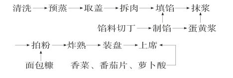 原料:活蟳10只100克/只,去皮猪五花肉300克,熟冬笋50克,净马蹄50克,番茄75克,萝卜酸15克,香菜5克,鸭蛋4只,葱末25克,面包糠75克,面粉15克,干淀粉10克,绍酒10克,绵白糖5克,白胡椒粉5克,精盐10克,味精3克,精炼植物油1500克(约耗150克)。