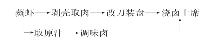 (2)调卤:将虾取出,滤出蒸汁入炒锅,加上汤烧沸,调入盐、味精、香醋、蒜泥、芝麻油成为味卤。