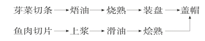 (2)芽菜加工:将黄芽菜柄切成13厘米×2厘米的长条,入熟猪油加热至100~110℃左右焐油至熟提出,待用。