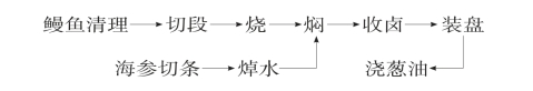 (1)清理:将鳗鱼宰杀去头、尾与内脏。烫洗去黏液,剞一字花刀,切成均等10段。将海参洗净漂清,亦成相等10根条块,焯透水待用。