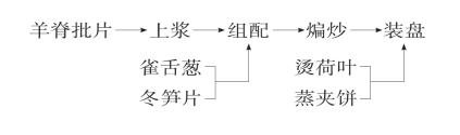 (3)组配:将葱白斜刀切大片,笋切长方片,与浆好的羊脊及其荷叶、姜丝、蝴蝶夹组合成菜肴生坯待炒。