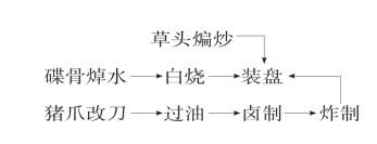 (1)烧味骨:将猪蝶骨焯水洗净,入锅。下糊葱油、姜片25克将蝶骨煸炒起香,加白腐乳汁、冰糖50克、白胡椒、绍酒25克、加清水500克、淹平蝶骨,烧焖1.5小时,至蝶骨肉质糯软。