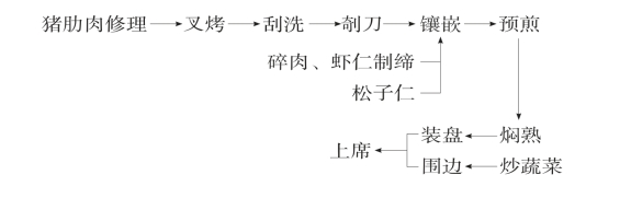 (5)装盘:将竹箅连肉方提出,皮朝上覆入大盘中,煸炒豆苗围边,原汤收浓加芝麻油勾流芡淋在松子肉方上即成。