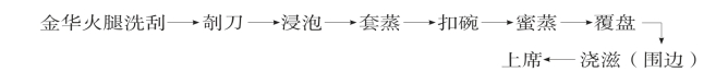 (1)整理:将金华火腿用碱水刮洗干净,批去外层,修理成8~9厘米宽的长方块,在肉面竖剞1/2深度刀纹5条,在清水中浸6~8小时,至火腿内咸味淡化至1/2。