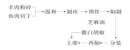 (1)制缔:将羊肉粉碎成米粒状,鱼肉切成黄豆丁,加10克X.O.酒,盐2克,酱油30克,干贝精粉,特鲜王2克,鸡蛋,湿淀粉,白糖30克,胡椒5克,五香粉,姜末、葱末,混合搅拌起黏,拌25克芝麻油成羊、鱼混合缔。