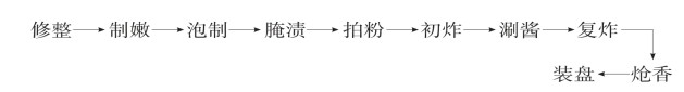 (2)腌渍预炸:将西芹、胡萝卜、球葱与姜、葱压榨出汁,加酱油、精盐、白糖、味精、蒜茸、花生酱和匀,对排骨腌渍翻拌至起黏上劲至味汁被吸入肉内时取出,撒干淀粉炝粉,入180℃油中初炸,至表面结壳,改用120℃油温蕴炸10分钟至肉熟捞出沥油。