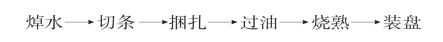 (1)生坯造型:①将猪肝、腌肉焯透水,切成8厘米长、1.5厘米宽的长条,将冬笋也切成同样长条。②将鸭肠剖开盐洗净,将上述三条集束扎成柴把形,修齐两端。