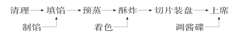 (1)清理、填馅:①将猪肚焯水割去肥油,刮净苦膜,内外用盐醋水洗刮干净。②将糯米酥泡2小时,南肉、冬笋、香菇、鸡肉匀切成小丁,与粟米、虾仁、豌豆一道加盐、鸡精、姜、葱末、绍酒、胡椒粉、芝麻油拌匀成馅,填入猪肚内,刀口用棉线缝合。