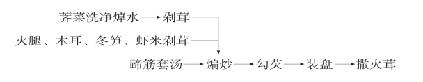 原料:混合涨发猪蹄筋750克[9],山荠菜500克,熟冬笋100克,水木耳50克,熟火腿40克,水发开洋20克,葱末20克,姜末10克,绍酒20克,精盐4克,鸡精3克,湿淀粉15克,清鸡汤1000克,熟猪油100克,芝麻油5克。