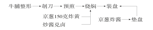 (3)成品造型:将300克京葱修齐两端成15厘米长段,入200℃油中炸香捞出,排入大盘中,再将牛肉取出排在京葱上,原汁过滤勾流芡下芝麻油包尾起亮,浇在牛方上即成。