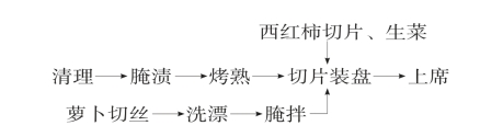 (1)清理腌渍:①将羊通脊剔净筋膜,顺长划两刀,放入盒内加葱20克、姜片10克、精盐、苏酒、酱油、白糖、胡椒粉、味精拌匀腌渍2小时。②将白萝卜去皮,切成细丝,漂洗干净,用醋精、白糖50克、盐1克腌渍拌匀待用。③将生菜削毒洗净辅在大盘里待用。