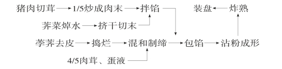 原料:猪五花肉350克,净荠菜500克,荸荠150克,马蹄粉25克,熟火腿150克,水发开洋50克,熟冬笋50克,冬菇100克,鸡蛋液80克,姜葱末各5克,炒糯米花粉100克,芝麻油250克,精盐15克,味精5克,熟菜子油1000克(耗100克)。