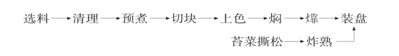 (2)焖制:用油先将京葱炸香成糊葱,滤出,留油50克与糊葱在锅里,排入肉块、姜块与盐、糖、腐乳汁、绍酒、酱油与原汤淹平肉身,加盖,煮沸后改小火焖制约20分钟至酥烂,移中火慢慢收汤。制下饴糖40克,至卤汁稠浓明亮。