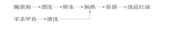 原料:净狗肉(带皮)1250克,甲鱼1只650克,绍酒75克,郫县豆瓣15克,精盐12克,酱油50克,阳江豆豉15克,海鲜酱10克,野山椒20克,花生酱10克,绵白糖15克,鸡精2克,葱白50克,姜块30克,草果2粒,大茴10克,13香粉5克,花椒15克,硝水25克,精炼油100克,水芹400克,蒜茸15克,红油10克,芝麻油20克。