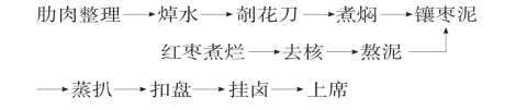 (4)蒸扒至熟:将肉方面朝下扒入大碗肉,将枣泥镶黏在肉面,注入原汤,封碗口,蒸小时至肉方酥烂时取出扣入盘中,将豆苗炒熟围在肉方四周,用原汤勾芡淋于肉方上即成。