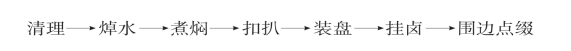 (2)预煮焖:①将竹箅垫在锅里,铺下牛如意与姜、葱,下五香卤淹平其身,再添加酱油、香醋、冰糖、红曲、绍酒。②将香茅与香蓼洗净,包1小香包埋在牛鼻下,下猪油,加盖盘与锅盖,旺火烧沸,移小火焖4~5小时至牛唇鼻软烂。