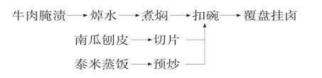 (1)牛肉预熟加工:①将牛肉用硝水与8克盐腌渍1天,洗净,焯水。②用上述香料加绍酒、红曲、冰糖、南乳汁、红酱油、油干红椒、姜片、水适量与牛肉一同煮焖3~4小时至牛肉基本酥烂入昧上色时取出晾凉,再压平冷冻收身。
