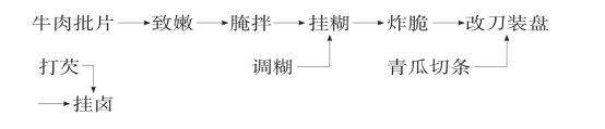 (1)致嫩腌拌:将牛脊批0.5厘米厚片,用10克食粉拌匀致嫩20分钟,洗漂尽碱味,吸干水分,两面排刀拍松,用美极鲜、精盐2克、姜葱汁、胡椒粉腌拌入味待用。