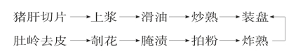 (1)猪肝加工:将猪肝顶刀批成鹅毛片,漂洗干净,吸干水分,用精盐2克,蛋清1只,绍酒5克与干淀粉15克将猪肝片拌匀上浆待用。