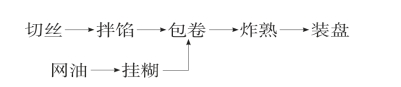 (2)包卷:①将网油洗净晾干,裁剪成10片10厘米×10厘米大小。②将鸡蛋、面粉与适量水调成糊,遍抹网油一面,将馅平分10份包成长条包。