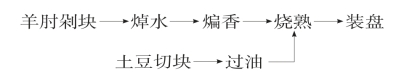 (2)烧熟:①将蒜子、泡椒、球葱块入锅,用100克油煸香,下咖喱再煸出香,将羊肘放入锅中,加绍酒继续煸起香,加入白酱油、白糖与清水淹平羊肘,大火烧沸,小火焖2小时至烂,拣去球葱。②将土豆块投入200℃油中炸起虎皮色,放入羊肘锅中,用大火收稠卤汁成为“自来芡”状,撒入芝麻油与味精拌匀起锅,装盘。