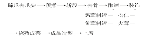原料:猪爪4只约1500克,净鸡腿肉200克,熟松子仁25克,白鱼茸150克,熟火腿茸25克,嫩草头200克,精盐6克,白酱油25克,红酱油25克,红曲粉5克,绍酒100克,绵白糖50克,味精3克,葱15克,姜15克,葱姜水50克,八角粉5克,猪肉汤500克,湿淀粉25克,芝麻油15克,精炼植物油200克。