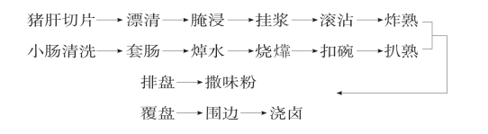 (3)组合成菜:①将套肠提出,切成3厘米段扣碗加原汤,上笼蒸扒20分钟,提出滤汤覆盘,用黄瓜(切佛手块)围边,将原汤加芝麻油、湿淀粉、味精1克勾流芡浇上。②同时另用180℃油将猪肝炸至壳脆提出围在一周;用花椒粉、味精、精盐、紫苏粉混合成味粉,装味碟跟上即成。