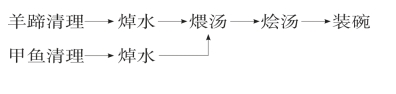 (2)烩汤成熟:将甲鱼清理、焯水后下入羊蹄锅中,加精盐、味精、沙姜粉、姜黄粉、甘草片,用旺火继续煨至汤汁稠厚,小甲鱼熟烂时,调入白豆蔻粉、胡椒粉、芥末油。
