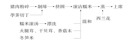 (2)生坯造型:①将糯米淘洗干净,在沸水中滚烫两次,淘洗后酥透。将熟冬笋切成米状丁与糯米、火腿末、香菇丁、干贝茸加盐2克、鸡精1克拌和。②将肉缔挤直径2厘米圆子20只,均匀滚沾上五彩糯米,即成生坯。