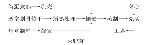 (1)备料:①将鸽蛋用文火煮熟,置凉水中剥壳。②由背部剔去鹅掌骨,修齐掌根与掌背,入95℃热水浸烫至软出锅压平,晾凉待用。③在虾茸中加蛋清、绍酒、姜葱汁,干淀粉,5克盐及味精混合成缔。④火腿切成茸、菜心烫熟待用。