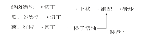 (1)料型加工:①将鸽肉漂洗去血水;瓜、姜漂洗去2/3咸味与葱白段、红椒一并切成0.3厘米小丁。②将松子仁焐油待用。