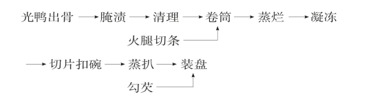(3)卷筒:将鸭肉漂洗干净,干铺案上,撒上干淀粉。再将火腿条分置鸭肉两端,相对卷成如意卷,用纱布将如意鸭卷裹扎结实,与鸭头与翅膀一道,上笼蒸2小时至酥烂。