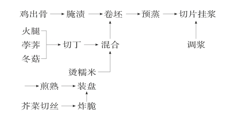 (3)卷坯:将糯米烫透无白心;火腿、香菇、荸荠皆切成0.3厘米小丁,将4料加绍酒、盐、味精拌匀成馅。将馅平铺在鸡肉面,卷成直径5厘米卷筒,再用纱布包卷紧,用棉线扎紧,蒸1小时,取出晾凉凝结。