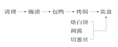 (5)装盘:将鸭包置大盘中上席,食时用小刀划开鸭包,去除肥膘肉,另用小盘分别盛白饼,京葱丝,甜辣酱跟上。
