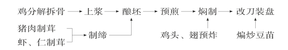 (1)分档去骨:将鸡按步骤分档取下鸡脯、鸡腿、鸡翅、鸡头,再分别去除鸡脯与鸡腿骨,鸡翅取齐,鸡头去。