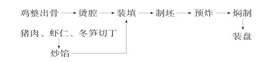(3)制坯:将三丁馅填入鸡腹约80%满,用鸡胚皮将鸡两翅圈扎起,抹酱油,入200℃油中预炸至金黄色。