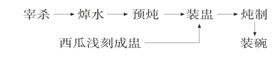 (4)运用浅刻刀法将西瓜表面刻出图案,在蒂下端开盖,挖去瓜瓤成瓜盅。用沸水将瓜盅里外浇烫一次。