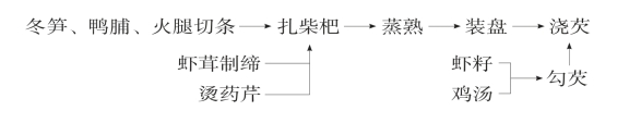 (1)扎柴杷:①将冬笋、鸭脯与火腿均切成0.4厘米×5厘米长条、冬笋40条,鸭脯与火腿各20条、酒10克、干淀粉拌匀。②将虾茸加盐1克、鸡蛋清与蘑菇精1克搅拌成缔。③药芹铺在案上,每4根笋铺在一根药芹上,抹上虾缔,按下火腿与鸭脯条各2根。提起药芹两头将上述各条捆成柴杷状。