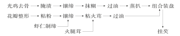 (2)花瓣生坯加工:②将花瓣修剪成同等大小的底宽5厘米、长6厘米弧形花瓣,遍沾干淀粉。②将虾仁粉碎加盐0.5克、鸡粉0.5克、鸡蛋清15克搅拌成缔,分别镶挂在10片花瓣1面,在花瓣尖端上匀沾上火腿茸,即成荷花瓣生坯。