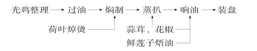 (2)焖制:①将荷叶去蒂焯烫,1张垫于砂锅底。②将鸡腹朝下放于锅中,下茄酱、酱油、白糖、姜葱、精盐、大茴、白胡椒、熟猪油、鸡汤。加热至沸,加盖1张荷叶,加锅盖移至微火焖约1小时,至鸡酥烂时取出。
