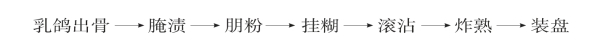 (1)出骨:①乳鸽去胫。头及双翅卸下留用。②由脊背剖开拆去脊骨、胸肋骨、腿骨及双爪。在胸脯肉上排刀拍松,用盐、绍酒、味精、五香粉、姜、葱将鸽子连同头、翅腌渍20分钟。